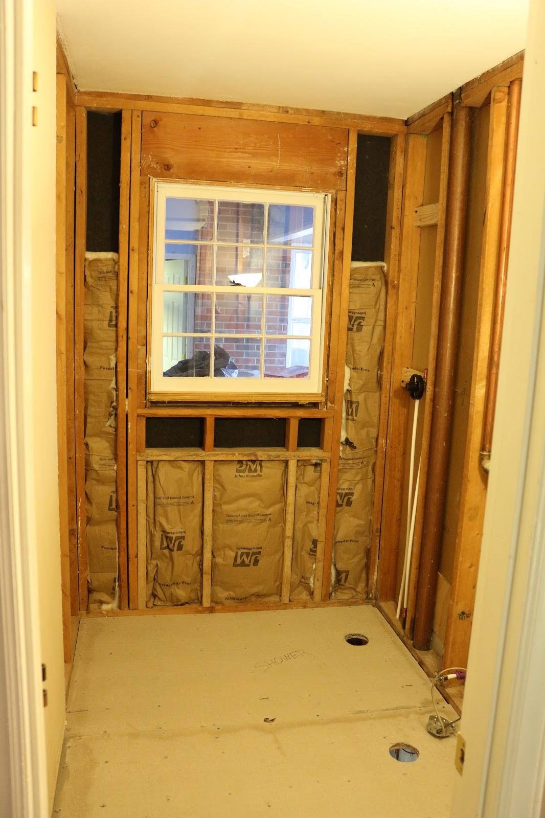 The floor didn't take long to put back in...convincing our college student, Kentrell, it was safe was another story. I think it was mainly the medications talking but he was convinced it wasn't safe to walk on. So glad we saved our baby gates, they came in handy not only keeping our children out but also reminding Kentrell that he couldn't enter the bathroom at night. After getting the floor in our next goal was to get a light installed, using a lamp was getting old fast. With this being a bathroom and prone to heavy water usage we wanted to make sure we took every effort to make sure the walls and floor resisted mold. We used Green Board for the walls (and later the ceiling) and concrete board for the floors and shower walls. The heating vent was located under the window in the original bathroom but since the shower was going there we relocated it next to the sink near the ceiling.Details