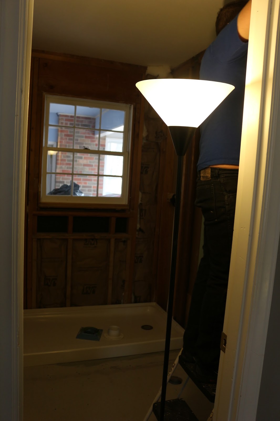 The day! I started tearing out the wall tile we found out our college student would not be leaving town after all. In fact he was having surgery! It was a bit of a shocker and a realization that we may have been to quick to start. Especially since we hit a snag with the plumbing. If I haven't said it enough I LOVE my dad! My parents came down so my dad could help get the plumbing and electrical moved around. Below is Mark is working on removing the sink. Code requires 36" spacing which was perfect for our new layout. You can see our new estimated placing for the shower, toilet, and vanity. Next step was to finish ripping out everything, the insulation was way overdue and the floor was rotten from a leak. Since we had already ripped out the kitchen down to the subfloor this was a piece of cake...except we were dealing with a MUCH smaller space.Putting it Back Together